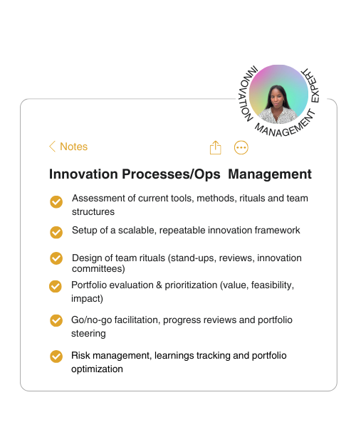 Whether you need to identify new opportunities, validate concepts, empower your teams, structure your innovation processes, or bring new solutions to market, I’m here to help you make it happen.