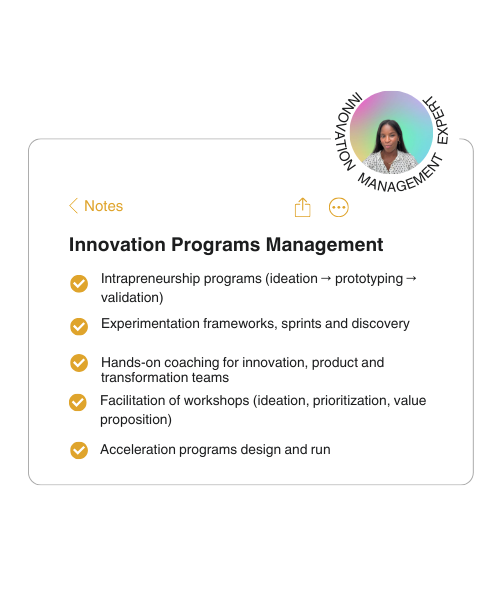 I help you build a clear innovation strategy, run structured discovery and experimentation, support internal teams, and ensure your portfolio moves toward tangible business outcomes.This model is ideal for companies that need innovation structure, clearer prioritization, or support to validate and launch new solutions.